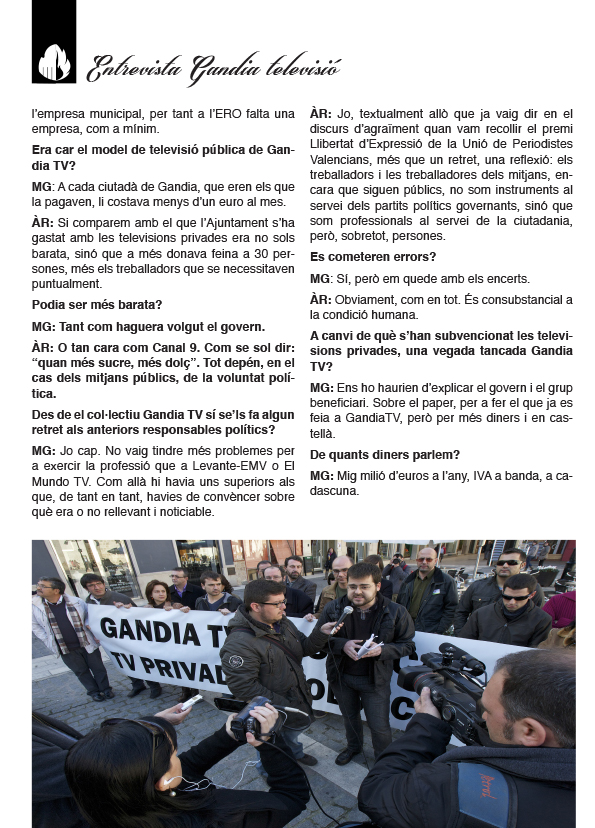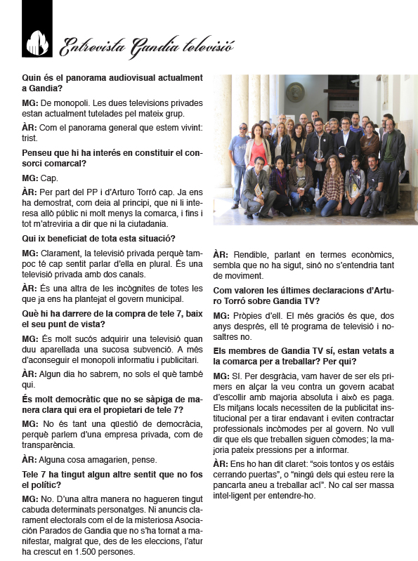 Hem entrevistat a dos membres del Col·lectiu Gandia TV Sí, format per treballadores i treballadors acomiadats quan es tancà la televisió pública, amb la intenció de conèixer què sentiren i com estan vivint este procés -fins i tot judicial- . L’entrevista es va realitzar el passat més de març, i participaren Marc Gomar i Àlex Ruiz, qui deixen clara la seua postura front al tancament de la televisió i de quina manera s’han configurat els mitjans després d’este fet. Un Col·lectiu que ha seguit lluitant pels seus llocs de treball i per defendre un mitjà públic, el que els va fer guanyadors del Premi Llibertat d’Expressió de la Unió de Periodistes de Valencians en l’any 2012.